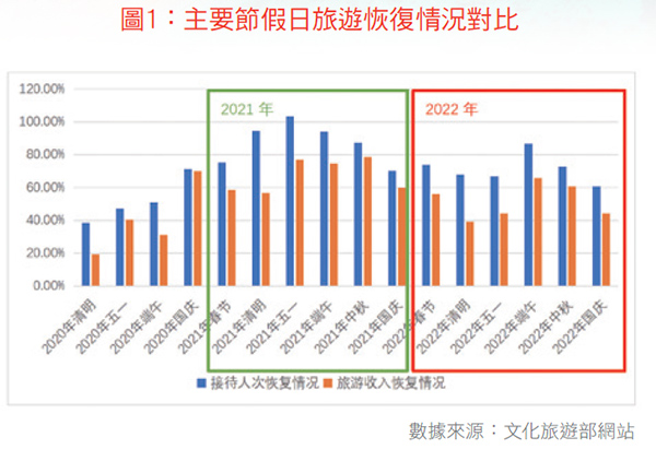 從節(jié)假日出游看,恢復(fù)程度走低。節(jié)假日是旅游企業(yè)重要創(chuàng)收增利的時點,假日市場對旅游經(jīng)濟基本面支撐作用顯著。受疫情影響,今年春節(jié)、五一、國慶等重要節(jié)假日旅游恢復(fù)情況不及預(yù)期,均低于2021 年恢復(fù)水平。節(jié)假日期間,居民出游更趨謹(jǐn)慎,出游距離、目的地游憩半徑等旅游活躍度指標(biāo)進一步收縮,市場主體獲得感進一步降低。