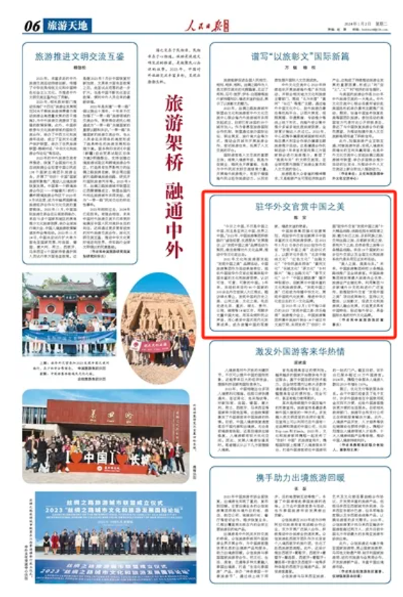 國之交在于民相親,民相親在于心相通。旅游是促進文明交流的橋梁,是凝聚民心共識的紐帶。2023年,中國對外旅游交流豐富多彩,呈現(xiàn)出勃勃生機。2024年開年,人民日報海外版發(fā)表中國旅游集團陳寅董事長署名文章,題為《駐華外交官賞中國之美》,介紹中國旅游集團以“發(fā)現(xiàn)中國之美”品牌活動為契機,推動中華文化走出去。文章內(nèi)容如下: