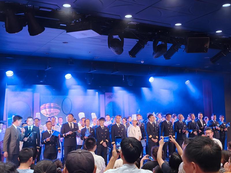 首航期間,“鼓浪嶼”號服務(wù)團隊展現(xiàn)高度的敬業(yè)精神與專業(yè)素養(yǎng),在客房服務(wù)、餐飲服務(wù)及活動組織等環(huán)節(jié)中,始終保持熱情周到、細致入微,全力營造舒適安心的航行環(huán)境。在餐飲服務(wù)方面,為滿足不同乘客口味偏好,由經(jīng)驗豐富的馬來西亞大廚團隊推出中西融合餐飲,自助餐廳分量充足、種類豐富。在互動體驗方面,為游客們準備豐富精彩的娛樂、購物等活動,安排八段錦、武術(shù)講座、非遺節(jié)目、沉浸式劇目體驗(滬上綺夢)、DIY手工玫瑰、酒吧駐唱、電影播放等,cdf郵輪免稅店煥新開業(yè),推出多重促銷活動。在娛樂演藝方面,由國際頂尖娛樂團隊特別為“鼓浪嶼”號傾力打造的主秀《絲路傳奇》和《霓裳馬戲秀》,掀起了與游客互動的高潮,獲得廣大游客的贊譽和好評。此外,為減輕海上風浪造成的不適感,郵輪還為游客提供免費暈船藥和暈船貼,密切關(guān)注乘客需求,第一時間解決問題,受到客戶一致好評。