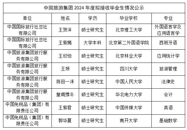 根據(jù)人力資源和社會保障部《關(guān)于做好2024年高校畢業(yè)生接收備案、報到上崗及材料審核等工作的通知》要求,現(xiàn)對我集團(tuán)在京企業(yè)擬接收2024年度應(yīng)屆畢業(yè)生情況進(jìn)行公示。