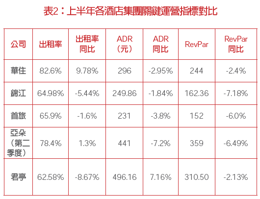 受上半年宏觀消費(fèi)以及去年高基數(shù)影響,上半年各大酒店集團(tuán)出租率表現(xiàn)分化,RevPAR、ADR則普遍出現(xiàn)下滑。上半年,受宏觀經(jīng)濟(jì)不確定以及消費(fèi)者信心不足等因素影響,商旅需求方面,差旅預(yù)算收緊,商務(wù)差旅活動(dòng)更多集中在中心城市。旅游需求方面,消費(fèi)信心下滑,酒店行業(yè)面臨消費(fèi)分級(jí)的壓力,此外,二季度開(kāi)始極端天氣明顯,出行減少。從出租率來(lái)看,華住和亞朵酒店保持了正增長(zhǎng),分別同比增長(zhǎng)9.78個(gè)百分點(diǎn)和1.3個(gè)百分點(diǎn);錦江同比下降5.44個(gè)百分點(diǎn),首旅則微降1.6個(gè)百分點(diǎn),君亭酒店下降8.67個(gè)百分點(diǎn)。從平均房?jī)r(jià)和間房收益來(lái)看,亞朵和君亭酒店作為中高端酒店的代表,其平均房?jī)r(jià)和間房收益明顯高于華住、錦江和首旅酒店,但從同比來(lái)看,受整體宏觀環(huán)境及惡劣天氣影響,亞朵和君亭酒店的同比降幅也較大,其中君亭酒店旗下新安江景瀾酒店遭受的持續(xù)大雨和洪澇災(zāi)害致使酒店停業(yè)抗災(zāi)長(zhǎng)達(dá)半月之久。華住集團(tuán)預(yù)計(jì)今年7、8兩月暑期數(shù)據(jù)將同比下降10%左右。