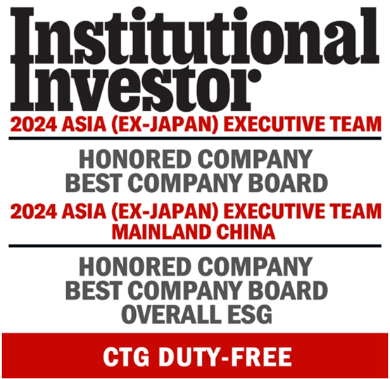 近日,國際權(quán)威金融雜志《Institutional Investor》公布了備受矚目的“2024年度亞洲最佳管理團隊”評選結(jié)果。經(jīng)全球近6,000名基金經(jīng)理和分析師投票,中旅免稅榮登亞洲地區(qū)及中國大陸地區(qū)雙榜單,并在可選消費品類別中榮膺多個重磅獎項:評選為“受尊崇企業(yè)”,榮獲“最佳董事會”(位列雙榜單第二名),“整體ESG表現(xiàn)”位列中國大陸地區(qū)榜單第三名。