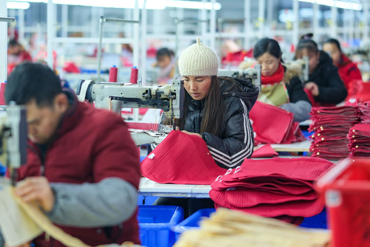 ??2024年1月18日,社區(qū)居民在紅安社區(qū)的鄉(xiāng)村振興就業(yè)車間工作。紅安社區(qū)是由易地搬遷安置區(qū)單獨成立的新社區(qū),位于湖南省湘西土家族苗族自治州鳳凰縣禾庫鎮(zhèn)。新華社記者 張鋮 攝