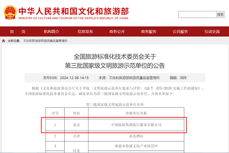 12月6日,全國旅游標準化技術(shù)委員會發(fā)布“關(guān)于第三批國家級文明旅游示范單位評定結(jié)果的公告”,中旅旅行榮獲“國家級文明旅游示范單位”稱號,是此次北京市唯一獲此殊榮的單位。