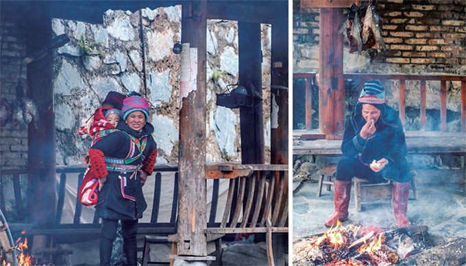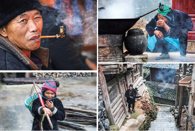 圖1-4:這樣吸煙,見(jiàn)過(guò)沒(méi)有?;老奶奶站在那里笑呵呵地望著我們;老奶奶在用傳統(tǒng)方法燒火;肩挑東西的侗家婦女很常見(jiàn)