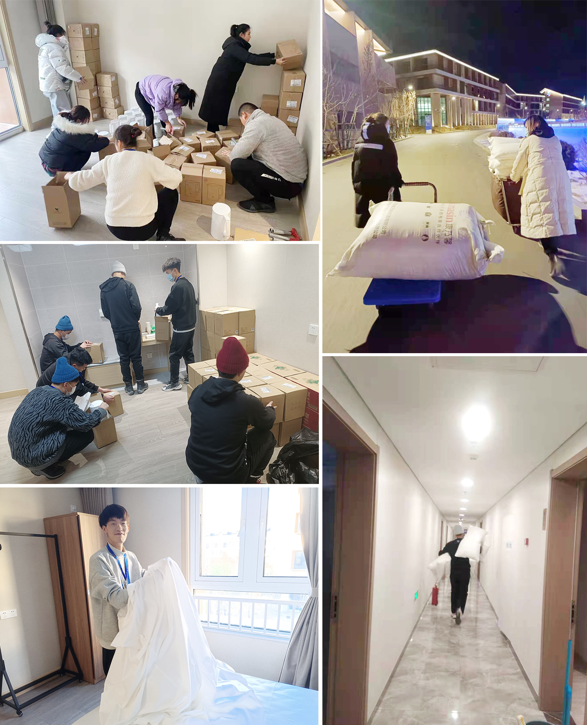12月21-22日是全要素壓力測(cè)試,跟以往測(cè)試不同的是,這次測(cè)試是要所有的客房物資移入并布置成可用房狀態(tài)。整個(gè)住宿組要從無(wú)到有,需要準(zhǔn)備出1300多套公寓、1600多個(gè)床位。我們需要承擔(dān)7號(hào)院的102套公寓、186個(gè)床位。當(dāng)?shù)弥形镔Y都統(tǒng)一放在3號(hào)院和超服中心,離我們7號(hào)院特別遠(yuǎn)。有困難自己克服,大家二話不說(shuō)。面對(duì)外面零下十幾度的室外溫度,我們一趟趟的運(yùn)包裹,一個(gè)個(gè)的拆包裹,一次次的送物資,……從白天干到夜里十點(diǎn)多,所有的物品都要擺放到位。所有人鉚著勁,只為順利通過(guò)全要素壓力測(cè)試。