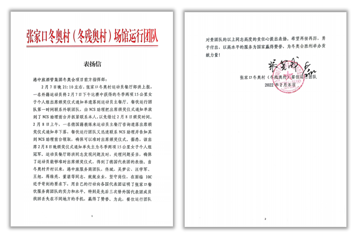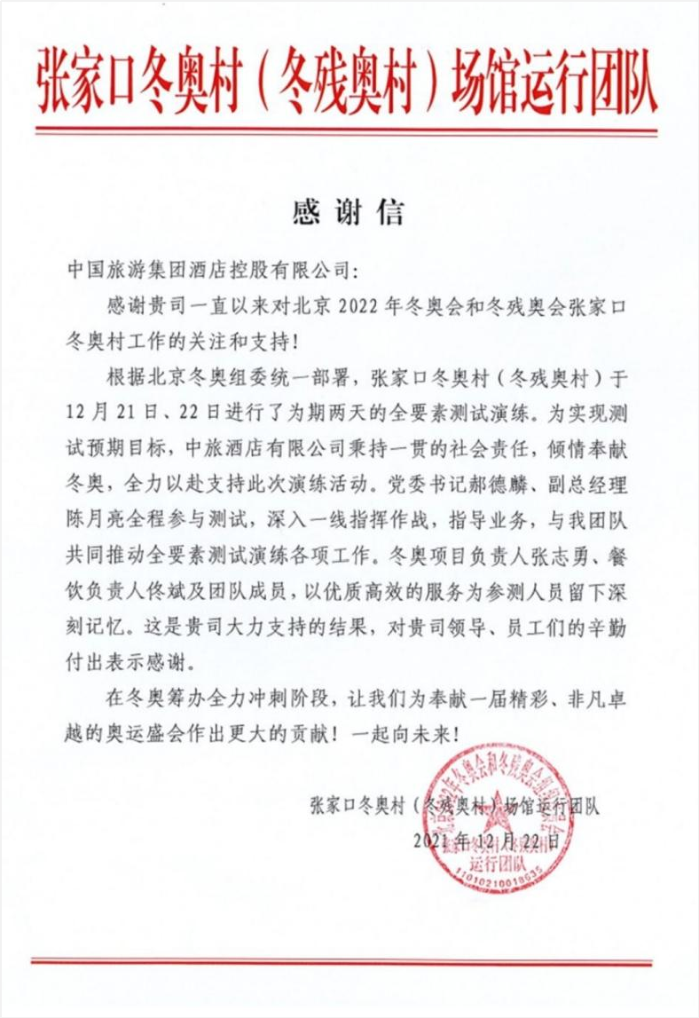 北京奧組委張家口冬奧村運行團隊先后向中旅冬奧服務團隊專致感謝信,對中旅團隊急人所急、主動作為的奉獻精神和兢兢業(yè)業(yè)、堅守崗位的敬業(yè)精神提出表揚,以多個真人真事概括了冬奧村開村以來的“中旅冬奧服務故事”,同時,信中點名表揚了多位中旅服務人員。