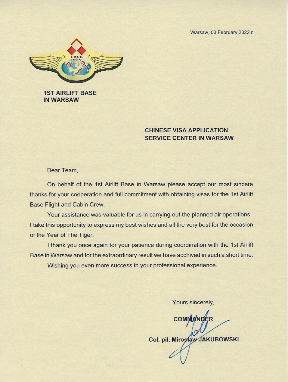 集團中旅旅行所屬境外各簽證中心為有關國家和地區(qū)參賽人員及賽事相關人員提供專業(yè)高效的簽證申請服務,讓他們在踏入中國國門之前就感受到中國人民的熱情友好,細致入微的服務給各國參賽人員留下了深刻的印象,陸續(xù)收到來自我駐外使領館、各國冬奧團組的感謝函件。其中,執(zhí)飛波蘭總統(tǒng)杜達訪華專機的波蘭空軍一號基地總司令Miroslaw JAKUBOWSKI將軍署名的感謝信,對華沙簽證中心為專機機組人員辦理加急簽證提供便利條件和熱情服務給予高度評價。