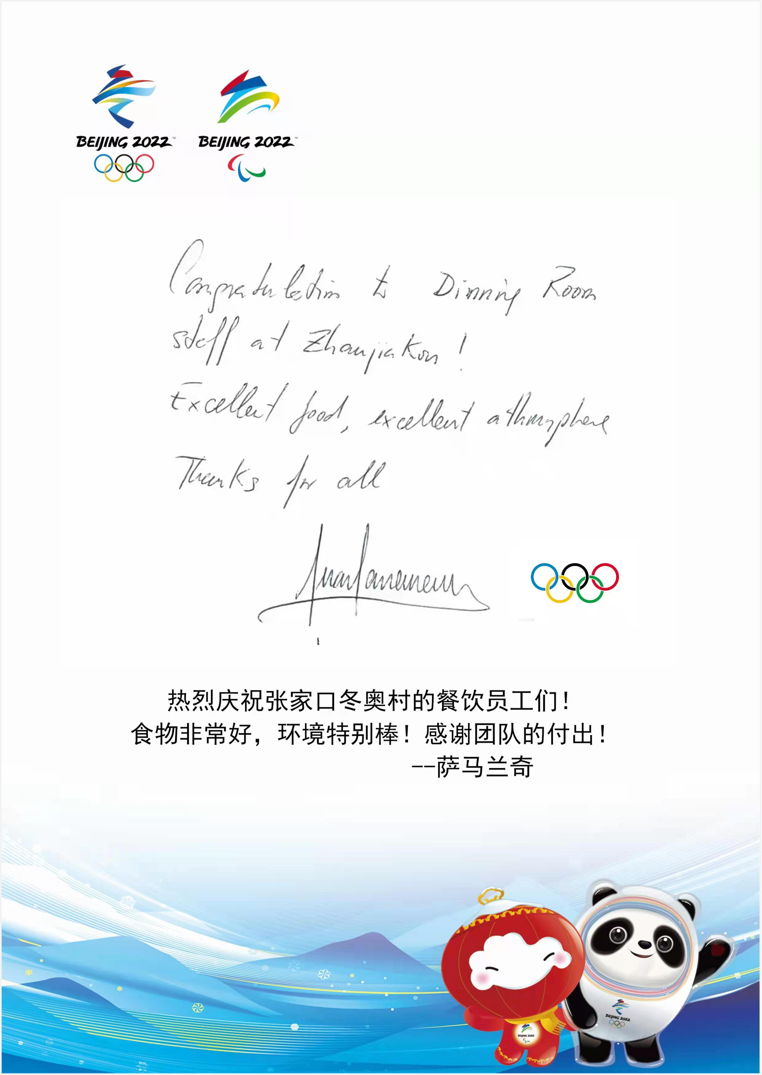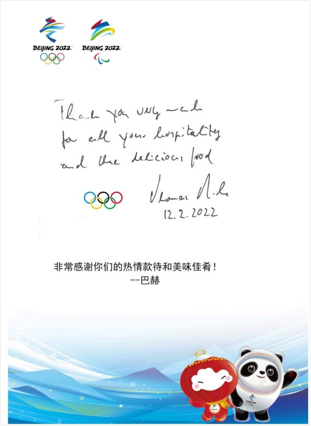 集團中旅酒店高質(zhì)量高標準提供住宿餐飲服務、接待服務,全力以赴做好各項服務保障工作,受到國際奧委會多次贊揚。國際奧委會主席巴赫在張家口冬奧村運動員餐廳就餐后,特別留言點贊張家口冬奧村的餐飲服務,寫道:“非常感謝你們的熱情服務和美味佳肴”。國際奧委會北京冬奧會協(xié)調(diào)委員會主席胡安·安東尼奧·薩馬蘭奇“微服私訪”張家口冬奧村運動員餐廳,經(jīng)過手消、選餐、取餐、用餐等一系列流程的親身體驗,他對張家口冬奧村的餐飲服務贊不絕口,并專門手寫感謝留言。