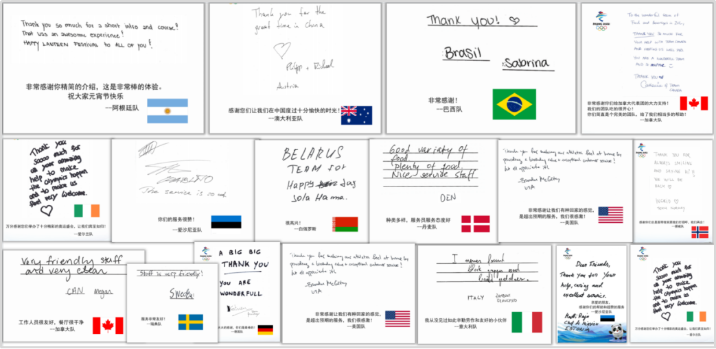 北京冬奧開村以來,中旅冬奧服務團隊陸續(xù)收到來自美國、加拿大、俄羅斯、法國、意大利、瑞典等國代表團的感謝信。信中對中旅團隊提供的熱情、細致、專業(yè)的服務予以肯定,并對工作人員表示衷心感謝。有關感謝信表示,“住宿和餐飲的感受能夠直接影響遠道而來的外國友人對于冬奧會乃至對中國的整體感觀。中國人都講賓至如歸,正是你們細致周到的服務,促進了冬奧會的順利舉辦,也讓大家感受中國的大國風采?!眮碜悦绹韴F的官方感謝信信中提及,在2月9日至10日美國隊運動員大范圍轉場這一最復雜的過渡期,中旅服務人員超越期待,及時完成了房間打掃和清理,讓新入村的人員感到很受歡迎。