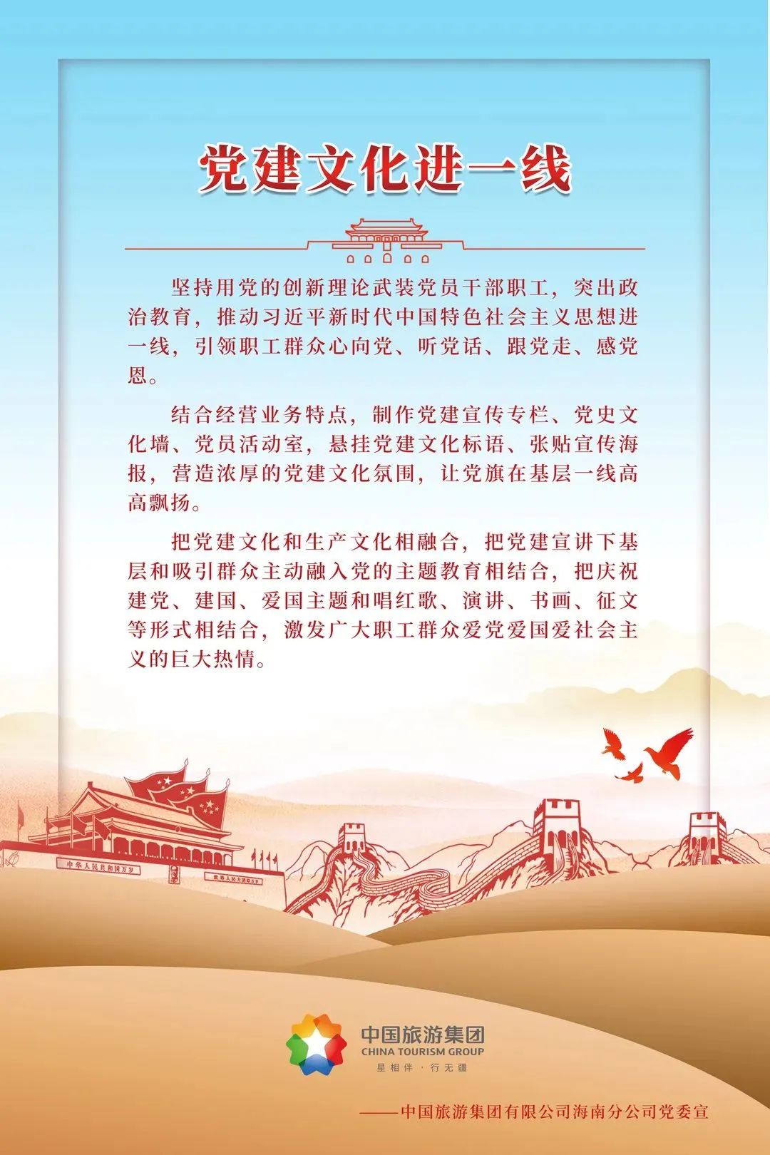 結(jié)合集團(tuán)海南區(qū)域經(jīng)營(yíng)特點(diǎn),積極培育黨建品牌,服務(wù)業(yè)務(wù)發(fā)展,聯(lián)動(dòng)各級(jí)黨組織打造了具有集團(tuán)特色、海南特點(diǎn)的“四進(jìn)一線”黨建工作品牌:“黨建文化進(jìn)一線、組織生活進(jìn)一線、黨員干部進(jìn)一線、關(guān)懷慰問(wèn)進(jìn)一線”,把宣傳黨的主張、貫徹黨的決定、團(tuán)結(jié)動(dòng)員群眾、推動(dòng)改革發(fā)展落到實(shí)處,強(qiáng)化黨建文化宣傳效果,得到廣大黨員、職工的熱烈響應(yīng),全面提升各基層黨組織的組織力,促進(jìn)黨建工作與生產(chǎn)經(jīng)營(yíng)深度融合,實(shí)現(xiàn)高質(zhì)量黨建引領(lǐng)集團(tuán)海南業(yè)務(wù)高質(zhì)量發(fā)展。