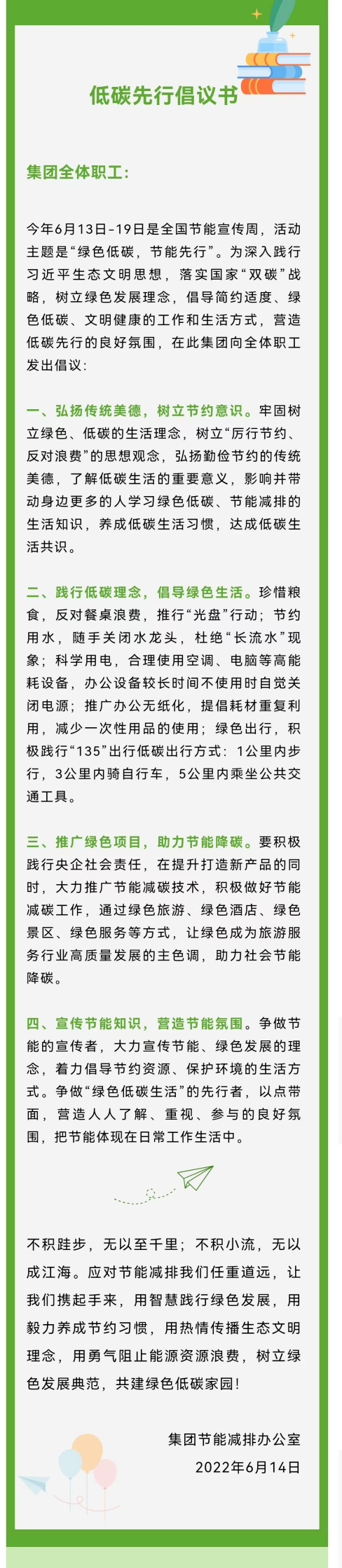實現(xiàn)碳達(dá)峰、碳中和,是黨中央經(jīng)過深思熟慮作出的重大戰(zhàn)略決策,是對國際社會的莊嚴(yán)承諾,也是推動高質(zhì)量發(fā)展的內(nèi)在要求。集團(tuán)深入貫徹習(xí)近平生態(tài)文明思想,落實國家“雙碳”戰(zhàn)略,樹立綠色發(fā)展理念,倡導(dǎo)簡約適度、綠色低碳、文明健康的工作和生活方式,營造低碳先行的良好氛圍。倡議書向全體職工倡議,要弘揚傳統(tǒng)美德,樹立節(jié)約意識;踐行低碳理念,倡導(dǎo)綠色生活;推廣綠色項目,助力節(jié)能降碳;宣傳節(jié)能知識,營造節(jié)能氛圍。倡議書號召全體職工攜起手來,用智慧踐行綠色發(fā)展,用毅力養(yǎng)成節(jié)約習(xí)慣,用熱情傳播生態(tài)文明理念,用勇氣阻止能源資源浪費,樹立綠色發(fā)展典范,共建綠色低碳家園。(集團(tuán)運營管理部/環(huán)境健康與安全監(jiān)管部)