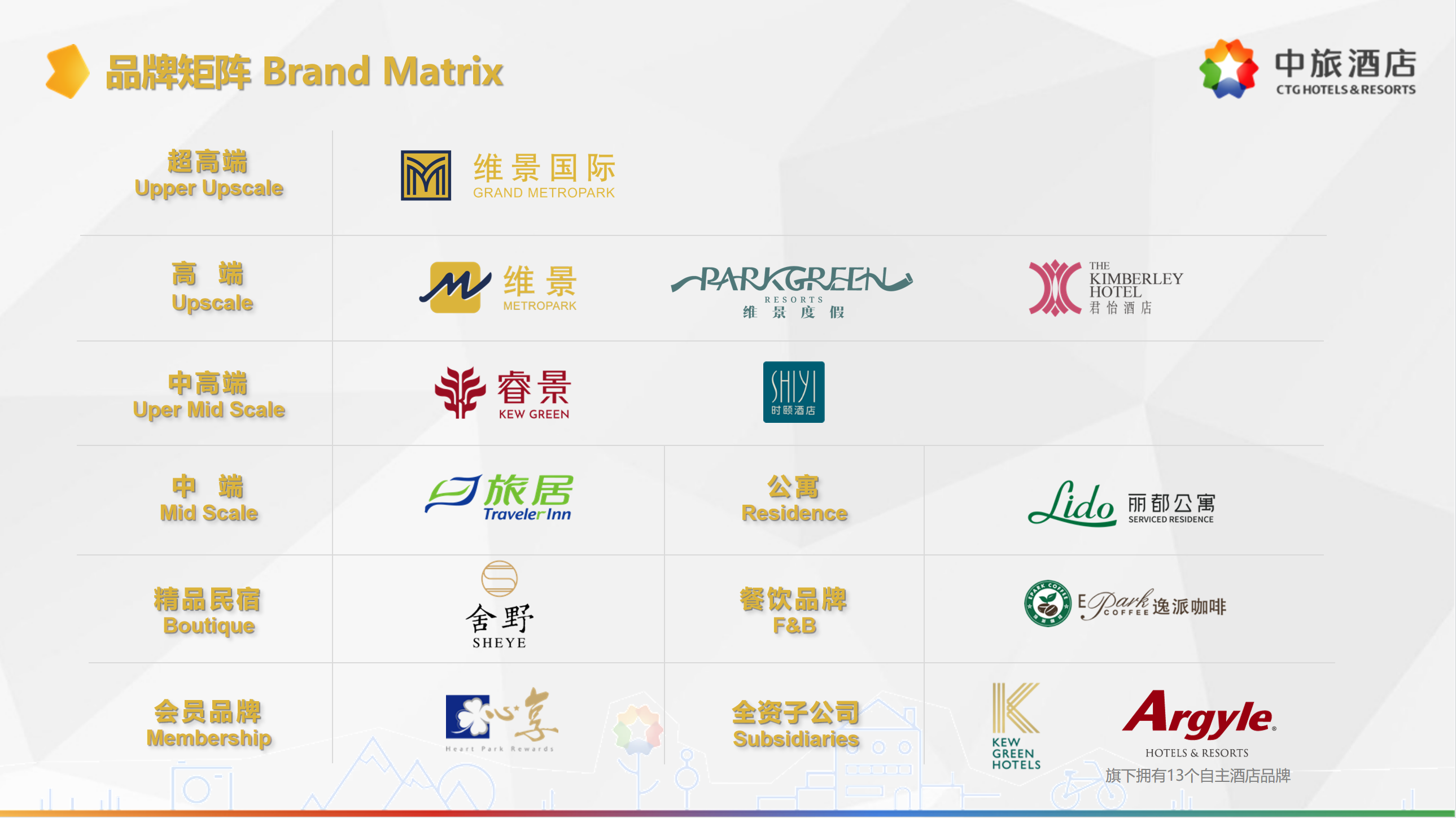 中旅酒店旗下?lián)碛小熬S景國際”“維景”“睿景”“旅居”“麗都公寓”“雅閣”“澳斯特”等二十余個品牌,覆蓋超高端、高端、中高端、中端、公寓、民宿等各類產(chǎn)品線,全資控股英國KG酒店集團,戰(zhàn)略投資雅閣酒店集團。